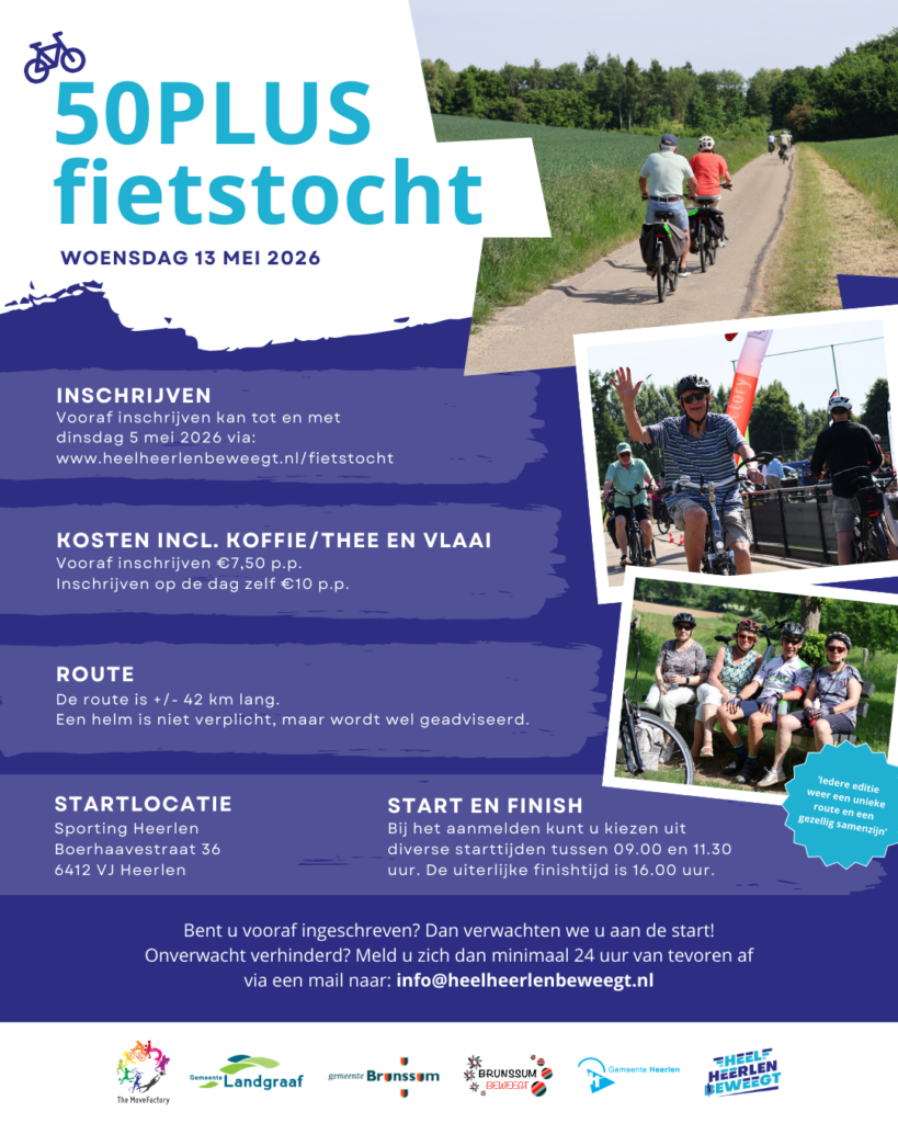 Op woensdag 13 mei 2026 vindt de 21ste editie van de 50PLUS fietstocht plaats. De route start en eindigt bij Sporting Heerlen en is circa 42 kilometer lang. Het wordt een unieke route met een prachtige pauzeplek, waar koffie en vlaai klaar staat.