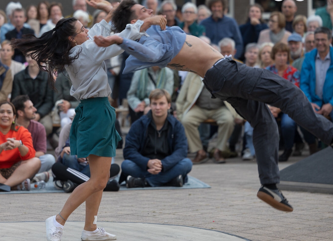 Gisteren veranderde het Sunplein in Nieuwenhagen in een dansende droomwereld. Mirage van Compagnie Dyptik nam ons mee in een hypnotiserende luchtspiegeling, een collectief verlangen dat tot leven kwam op het plein. Dansers raakten verstrengeld in een ritueel van energie, strijd en verbondenheid, en het publiek werd meegezogen in deze magische voorstelling.