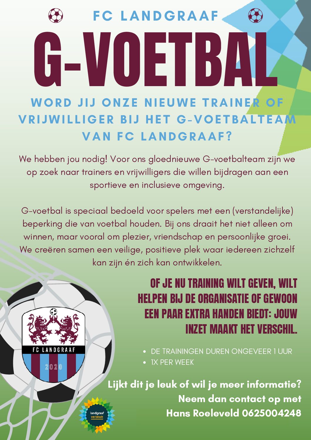 Landgraaf krijgt er iets moois bij, een gloednieuw G-voetbalteam! En daarvoor zijn we op zoek naar enthousiaste trainers en vrijwilligers die samen met ons willen bouwen aan een sportieve en inclusieve omgeving.