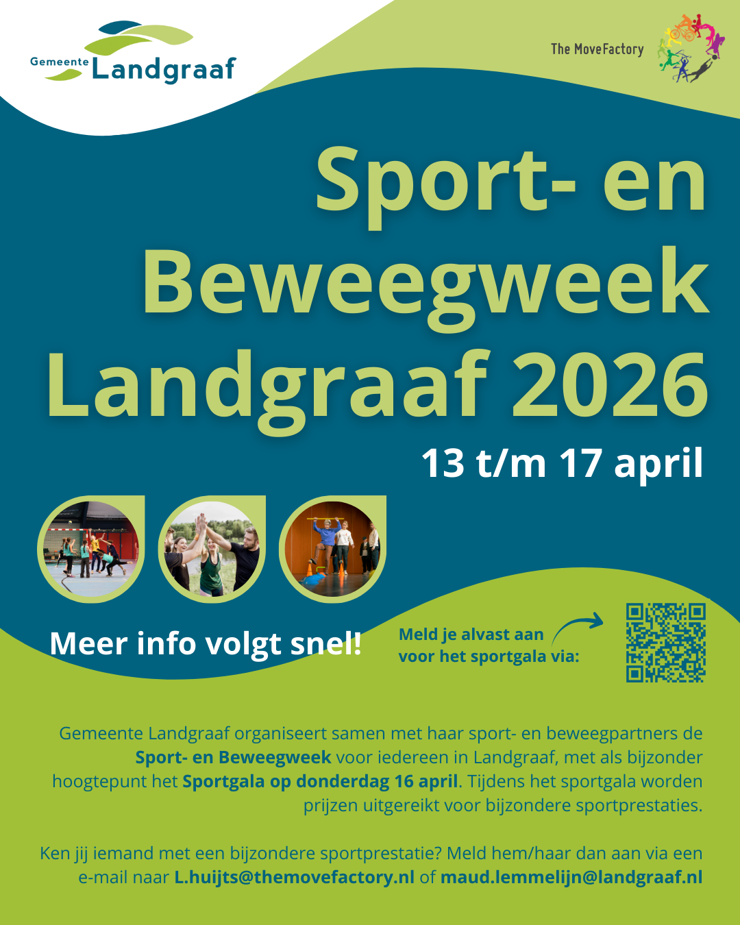 Tijdens het Sportgala, dat plaatsvindt op donderdagavond 16 april, worden personen of teams die een bijzondere (sport)prestatie hebben geleverd, in het zonnetje gezet. De selectie hiervan wordt mede door jullie inbreng bepaalt! Dit kan worden doorgeven door een mail te sturen naar maud.lemmelijn@landgraaf.nl of l.huijts@themovefactory.nl.