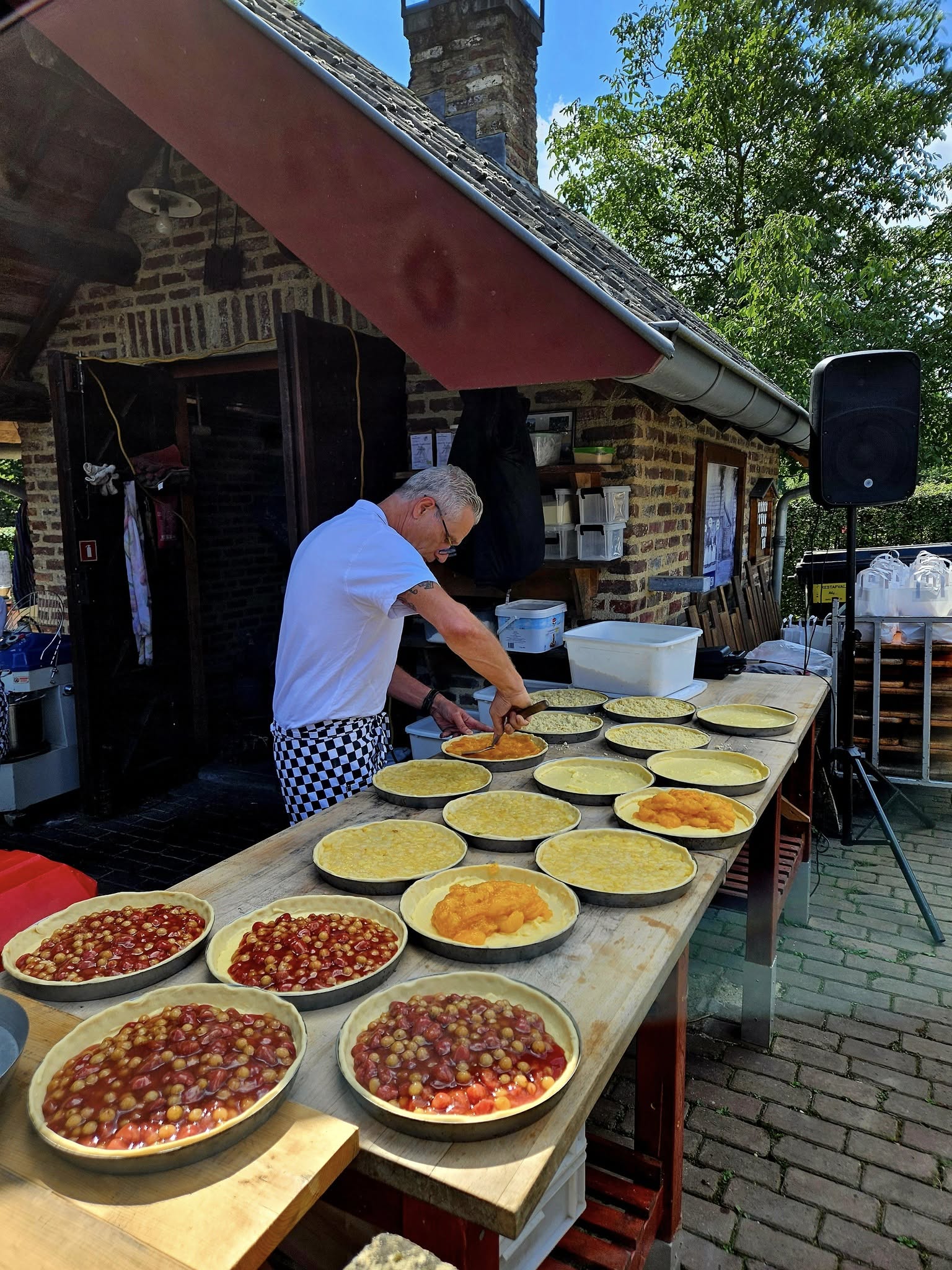 De schoorsteen van het bakhuisje rookte, de oven knetterde vrolijk en de geur van versgebakken broden en vlaaien vulde de lucht. Op de achtergrond zorgde een live bandje voor extra sfeer. Je voelde dat het een speciale dag was.